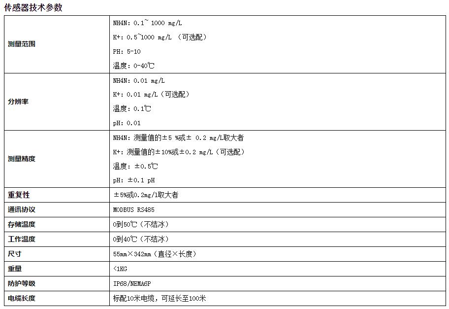 氨氮傳感器由銨離子選擇電極、鉀離子(可選)、pH 電極、溫度電極共同組成一個一體式傳感器,這幾個參數可以相互修正氨氮的測量值,同時實現多參數的測量。