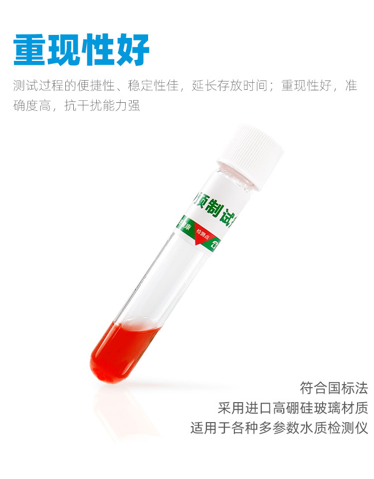 測試過程的便捷性、穩(wěn)定性佳,延長存放時間;重現(xiàn)性好,準確度高,抗干擾能力強,采用進口高硼硅玻璃材質(zhì)適用于各種多參數(shù)水質(zhì)檢測儀,作為綠色試劑,減少接觸化學危險品的機會,確保操作人員的身體健康