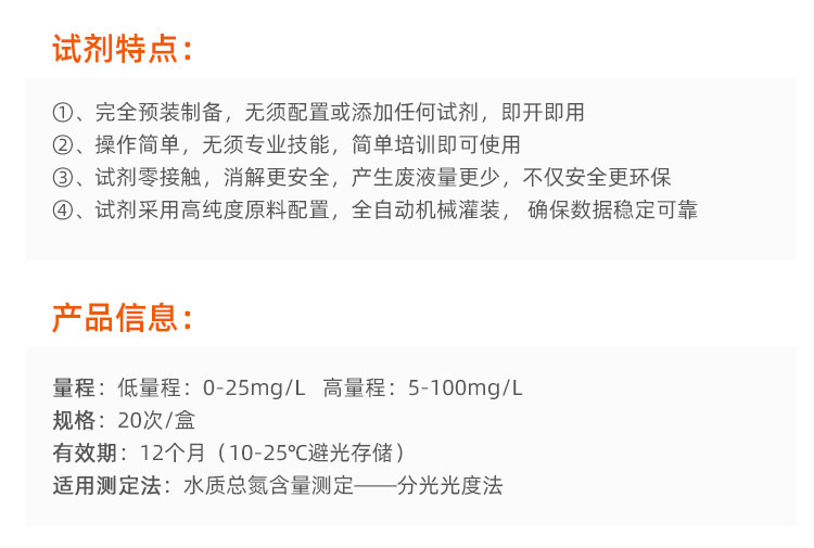 測試過程的便捷性、穩定性佳,延長存放時間;重現性好,準確度高,抗干擾能力強,采用進口高硼硅玻璃材質適用于各種多參數水質檢測儀,作為綠色試劑,減少接觸化學危險品的機會,確保操作人員的身體健康