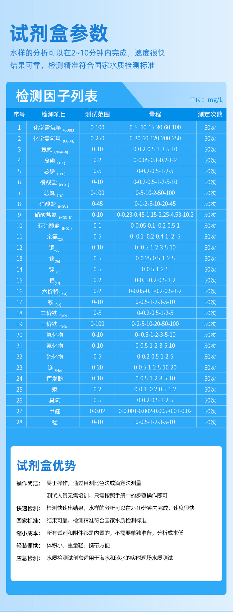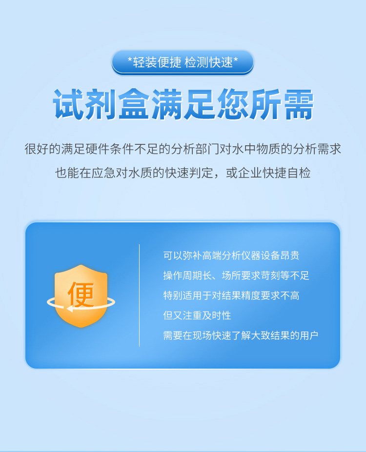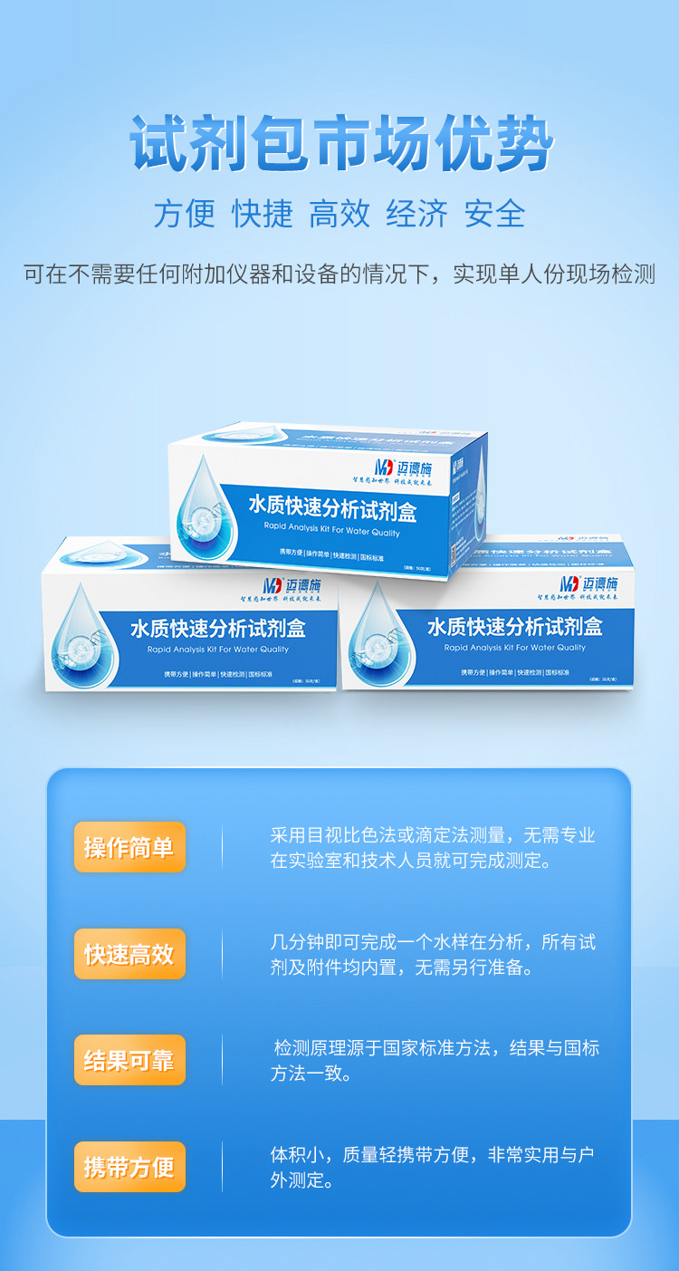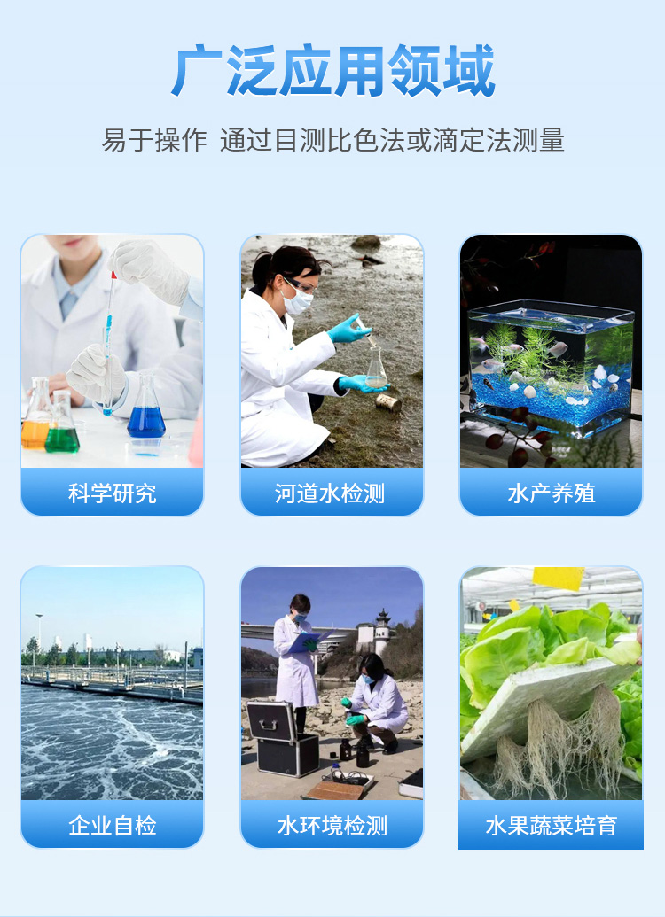 由于試劑包的快速便捷性,應(yīng)用的領(lǐng)域廣闊,適合各種水環(huán)境檢測以及科研實(shí)驗(yàn),河道水檢測,水產(chǎn)養(yǎng)殖檢測,企業(yè)自檢,水培果蔬檢測。