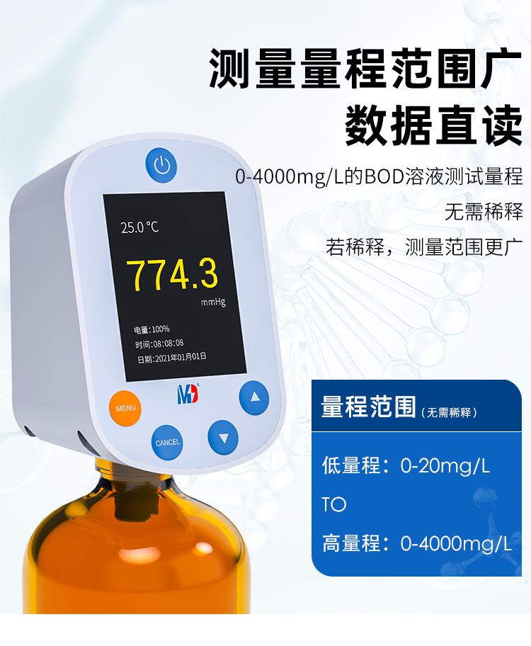 7、測量范圍廣,無需稀釋測定BOD:0-4000mg/L,若稀釋測量范圍更廣
