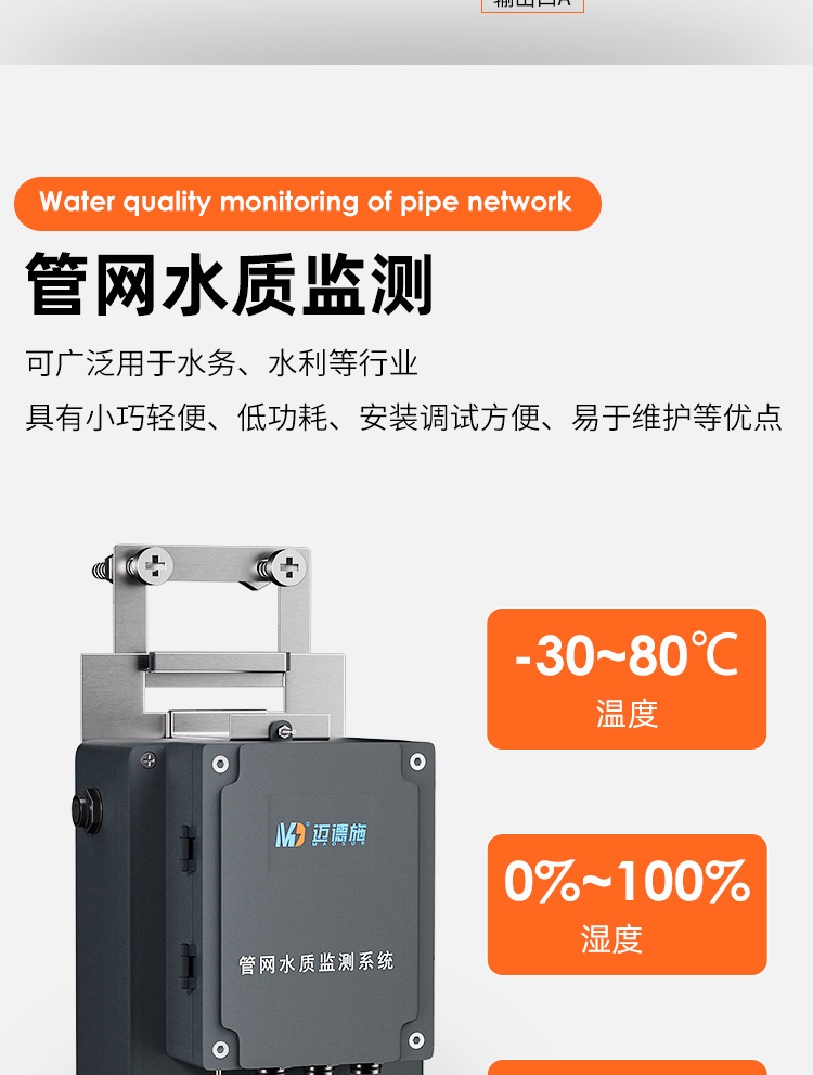 MDS-GW100地下管網水質監測系統,集監測電極、供電電源、數據傳輸、系統控制于一體,便于客戶使用安裝維護。監測電極可自由組合PH、電導率、溶解氧、濁度、COD、氨氮、葉綠素、藍綠藻、水中油等多個因子。內置高容量鋰電池,給監測電極、控制系統、數據傳輸模塊供電,采用節能模式電池可用6個月時間。數據傳輸模塊可選4G、CDMA、BD等方式,上傳至指定平臺。控制模塊可設置節能模式,可設置、校準電極。