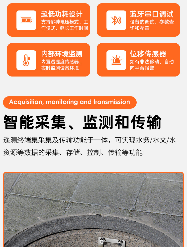 適用于液位、雨量、流速、流量、溫度、壓力、光照、風速等各種傳感器數據智能采集、監測和傳輸。